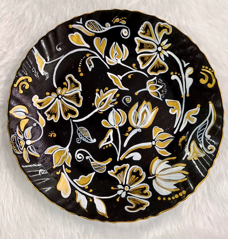 ceramic wall plate beautifully painted in floral art Design. Brusto colors are used to get the smooth texture, art varnish is used to lock the paint and it has glossy texture, hanging cllip is fixed to hand it in your desired wall.